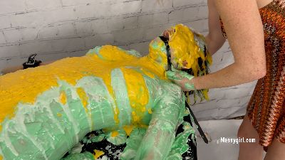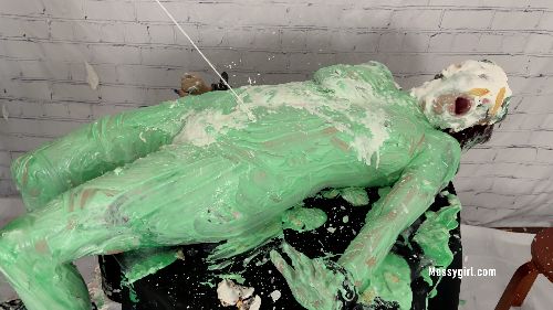 Mystique returns for more sexy and silly messy playtime. She is pied and slimed while wearing a fishnet stocking. She shows it all as she goes full nude.