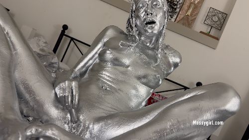 Santana is covered in gold paint for the first time. Once she is covered, she brings out her vibrator and gives herself multiple body twitching orgasms. Hot!