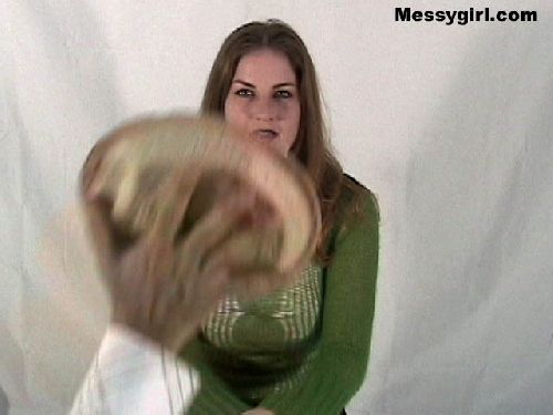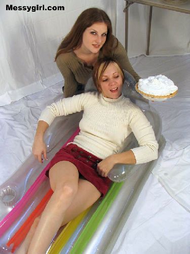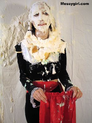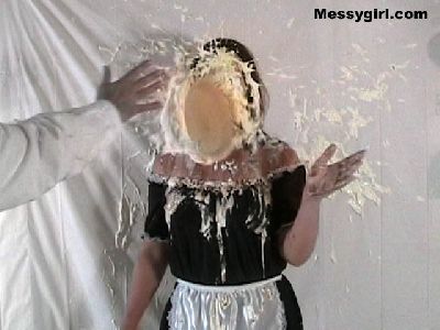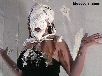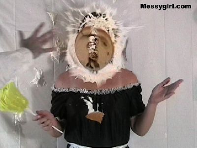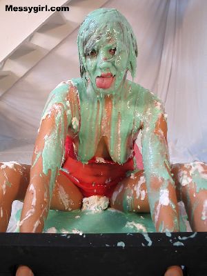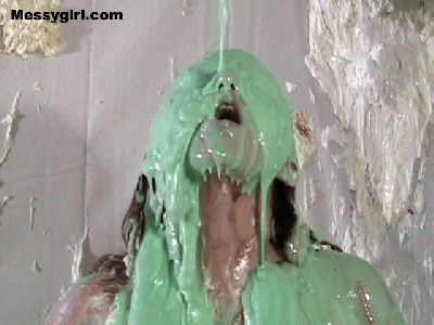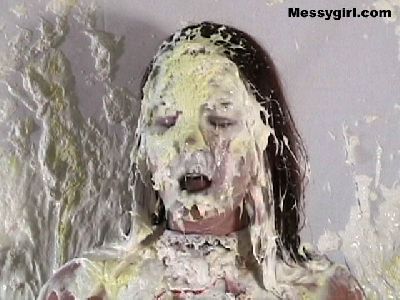 Cindy is pied and slimed for the first time. She takes on the mess like a pro! So much so that it turns her on as she rubs it all over herself.