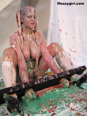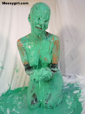Allison is in only thong panties, stockings, gloves and heels. She is covered in 3 colors of slime and topped off with pies to her face and ass!