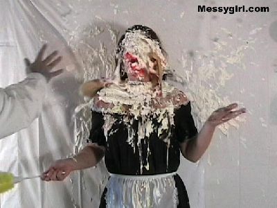Linda is dressed as a maid when she is pied and covered in pudding! Sara walks in and complains to Linda. So Linda gives it to her full force!
