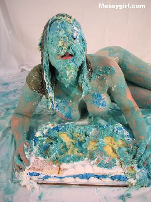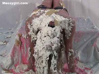 It’s Amber in her very first solo shoot. She starts out wearing a sweater top, skirt, stockings, panties and PVC boots. Amber shows just how much she loves to get messy with a pie onslaught, head dunking, slime pours and going face first in a large sheet cake! She makes sure she is covered head to toe as she slowly strips nude for her bare butt pieing!