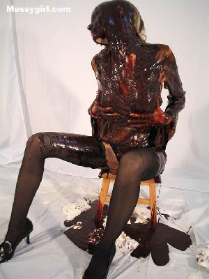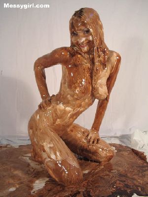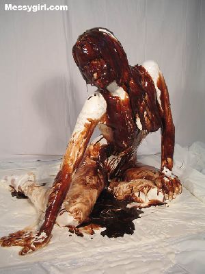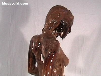 Liz is in her thong bikini as she covers herself in sticky marshmallow cream. She goes nude to cover all the other clean areas before a gallon of chocolate syrup poured on her. A very erotic transformation!
