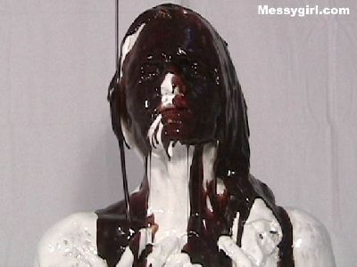 Liz is coated in sticky marshmallow cream wearing her thong bikini and heels. She takes off her bikini to cover her private parts before a gallon chocolate syrup is poured on her!