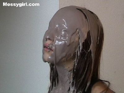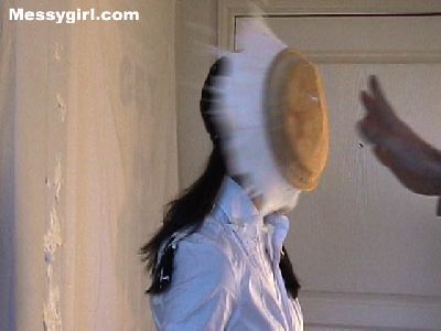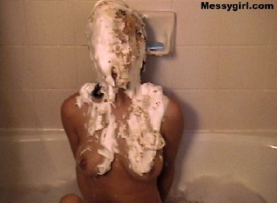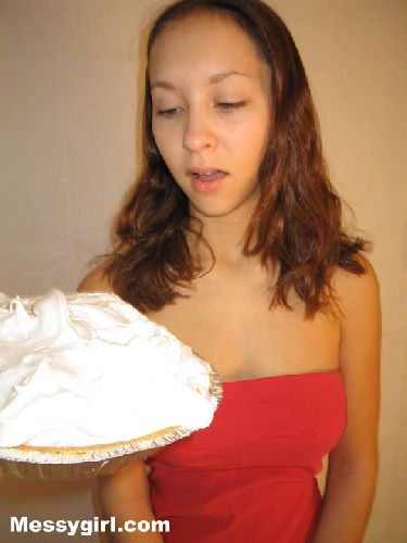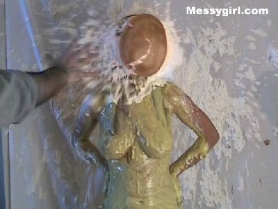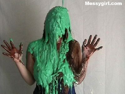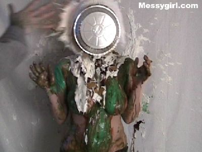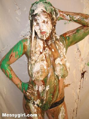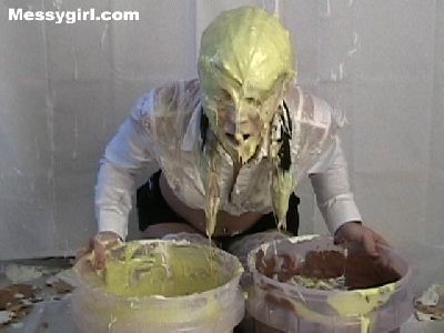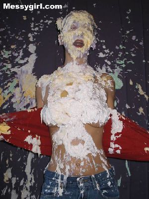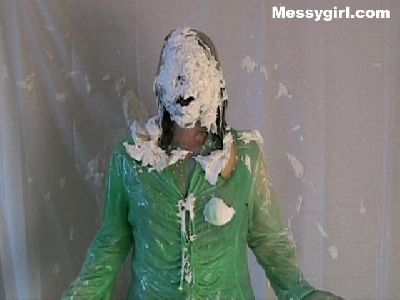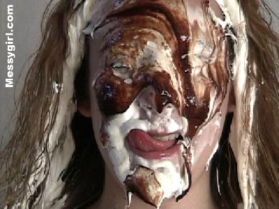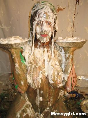 Raven enjoys her first messy session in and out of her body stocking. She is covered in pies, batter and chocolate syrup!
