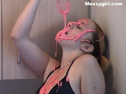 Our newest messygirl Nikki covers herself in pink batter and green syrup and then washes off in the shower.