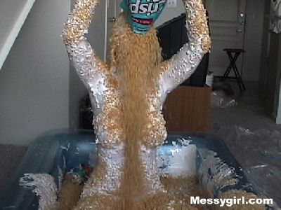 Sara covers herself head to toe in marshmallow cream and then tops it off with rice crispies. What a treat! She then washes off in two gallons of milk.