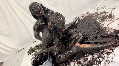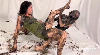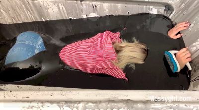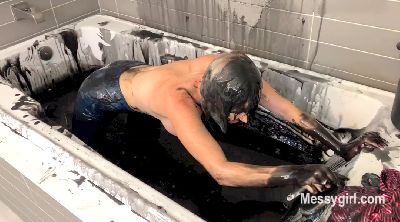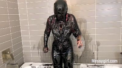 Zoey is called in to clean a mess made in the bathroom. She is shocked to see the bathtub is filled with black sludge. So she reluctantly starts to clean it, but unfortunately she slips and falls face first in the sludge. She keeps trying to clean it, but keeps falling into the black sludge. She ends up nude and totally covered by the time she is done.