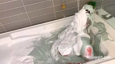 Busty Tatum is relaxing in a nice warm bubble bath as she reads a magazine and drinks champagne. All is well, but then out of the blue, she has creamy slime poured over her head. The pouring keeps coming as she tries to compose herself. Tatum looks like a busty human blob by the time it stops.