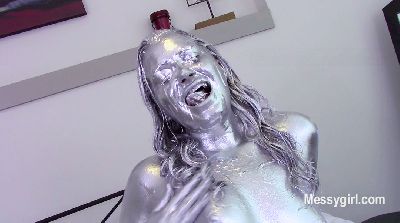 Amber is nude and in bed while she covers herself head to toe in silver paint. You get a front row view of every inch of her hot body as she slathers it and is transformed into a sexy silver hottie.