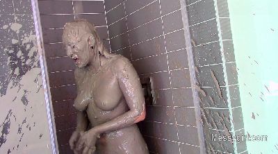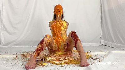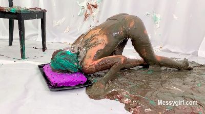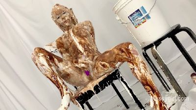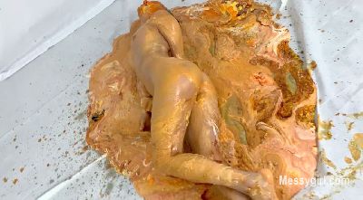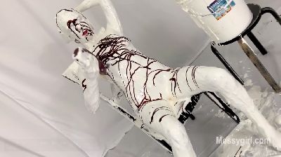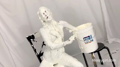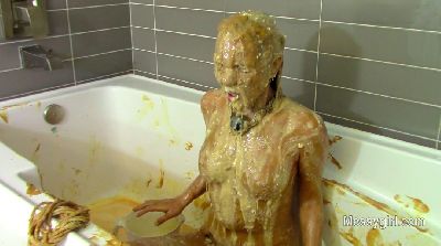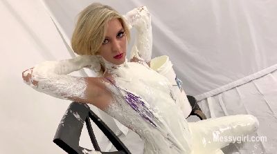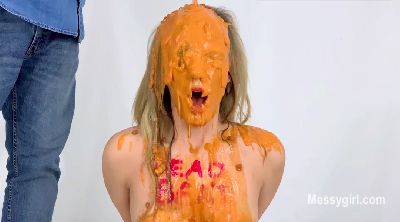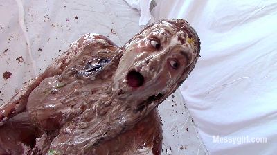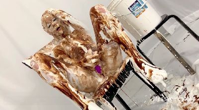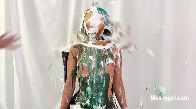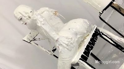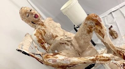 Kerri Taylor returns and we set her up for some Messygirl style bondage. We duct tape her nude to a chair and gag her. She is now at our mercy. You can tell she is nervous as she eyes open wide. Her eyes and face soon disappear in a barrage of pies to the face. This is followed with thick slime over her head. She can't move as the mess drips down her hot body. The camera pans around so that the viewer can see the aftermath. She is moaning and this tells us she can't take it anymore. So she is cut free, but continues to smear the mess as she shows off her body.