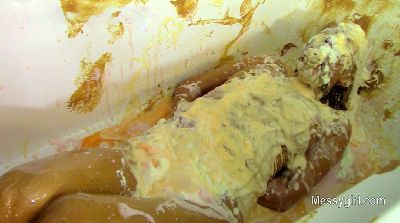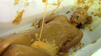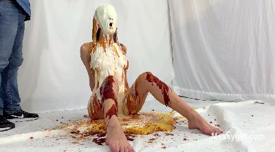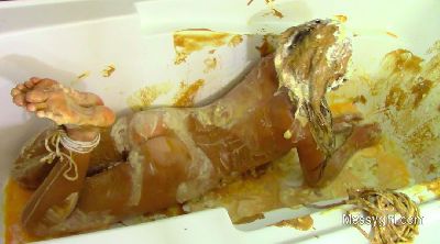 Sabrina's rent is due and she is desperate. Her landlord tells her she needs to pay it now or be evicted. She tells him she will do anything to keep from being evicted. So he tells her she needs to be his messy little bitch. He takes her to the bathroom, makes her strip and get ion the tub. He then proceeds to covers her in peanut butter, ice cream, honey and yogurt. Poor Sabrina is also hogtied as he does this to her.