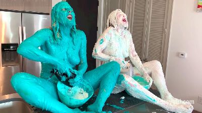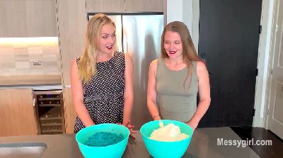 Vika returns with her baking show and this time she wants to show the fine art of how to use frosting. She calls on an assistant from the audience to help her out. The audience member is excited to help, but asks where are the cakes. Vika tells her that instead of cakes, they will be the ones getting covered in frosting. So the girls strip nude and get on the countertop. They then slowly smear the frosting on themselves. Once they are covered head to toe, it's time to make more frosting. So they put bowls between their legs and hold it tight against their pussies. They then use hand mixers and start to mix the frosting. The vibrations sends them into ecstasy as they keep mixing. It doesn't take long for the girls to have mind blowing orgasms. The girls make out after they cum.