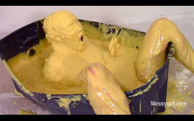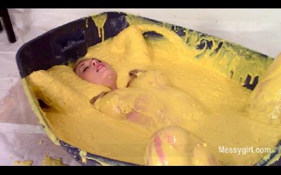 Amy does her very first messy submerging shoot. You will enjoy watching her strip nude and going under the tub filled with thick poundcake batter.