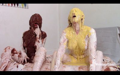 Husband sacrifices his Asian wife, Katy, to Amy, fulfilling his dirty desire for lesbian fun. Amy pies this cutie till she loses count and submerges her beautiful face in buckets of chocolate batter. Amy then pours the batter over Katy`s head and rubs butter cream on her tits and lips. Before you know it, Katy is totally covered head to toe in the mess. Amy finishes her off with a cream slime pour. Katy also gets spanked and has her hair pulled, making her an official MessyGirl.