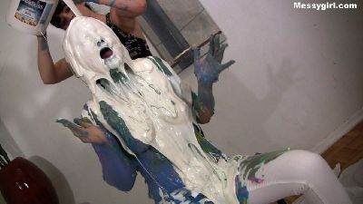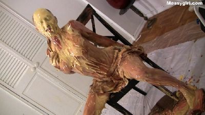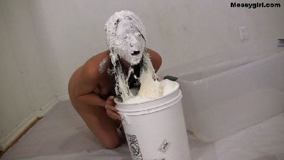 Penelope starts out nude and goes head first in the 5 gallon bucket of sticky fluff. She then starts to coat her sexy body and face until she is an unrecognizable blob. Once covered, she masturbates until she cums.