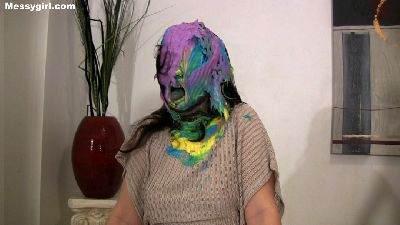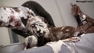 Tara Tied is nude and tied spread eagle on a mattress. Then she is pied and slimed head to toe. Her exposed pussy also gets a nice coating of slop. She then is untied and plays in the slop like a happy little messygirl.