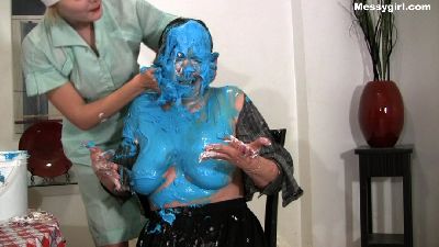 Deni starts out wearing white jeans and a white top. She is pied first and then takes a bucket of hot pink slime over hear head. She is ordered to take off her top and gets more slime. Once totally covered, she takes off her jeans and pulls down her panties for a pie to the ass and gets a wedgie. Deni then goes nude for more pies and a chocolate sliming. Finally she is instructed by Vika to play in the mess on the floor.