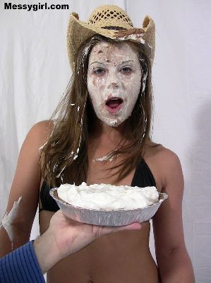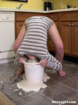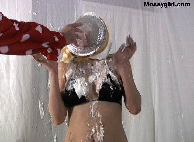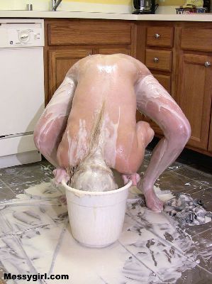 Liz does some extreme head dunking in heavy cream. She ends up nude and covered head to toe in the slippery stuff.