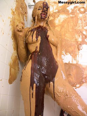 Liz covers herself head to toe in gooey peanut butter and then tops it off with chocolate syrup.