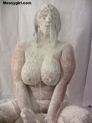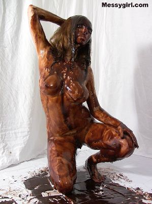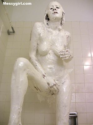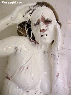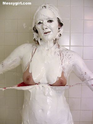 Busty Vicky is in a red body stocking as she gets the messygirl treatment. She ends up nude and totally covered.