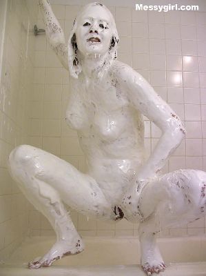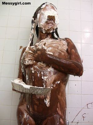 Fae returns and this time she is nude in the shower as she pours chocolate batter over her head. She rubs it all over and then adds a pie to the face.