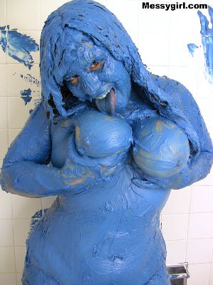 Busty Vicky covers herself head to toe in blue butter cream icing and tops it off with chocolate syrup.