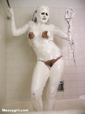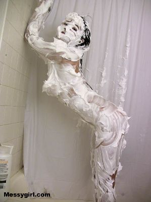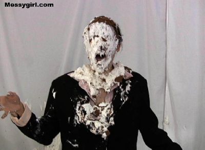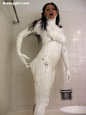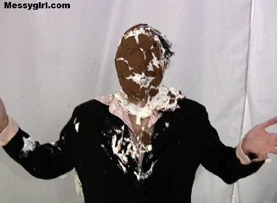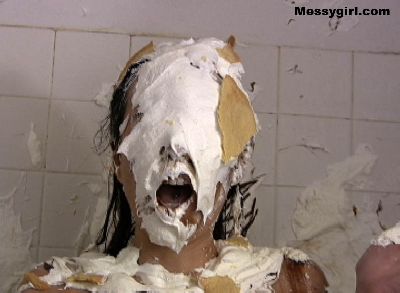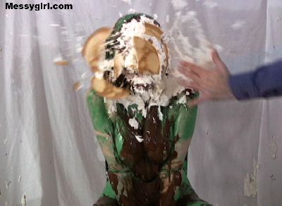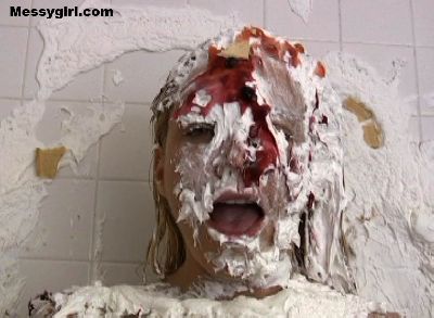 Lane's relaxing shower turns into a pie attack. She takes the pies hard to the face. She then gives in and plays in the pie mess.