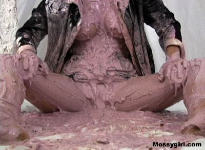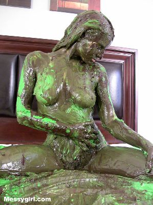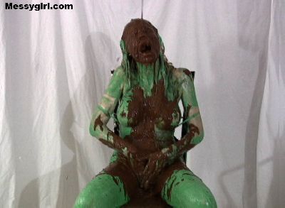 Busty Vicky is in a red body stocking as she gets the full messygirl treatment with pies, pudding, ice cream, chocolate and blue slime. She ends up nude and covered in the sloppy mess from head to toe.