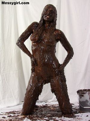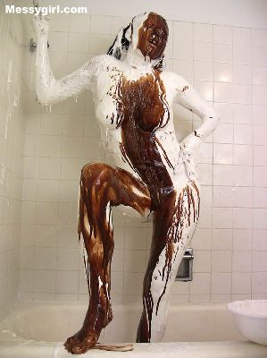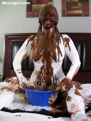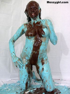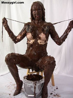 Brittany is in a bikini as she covers herself head to toe in chocolate fudge icing. She then strips nude and has chocolate syrup poured over her head. She mixes it all over her body!