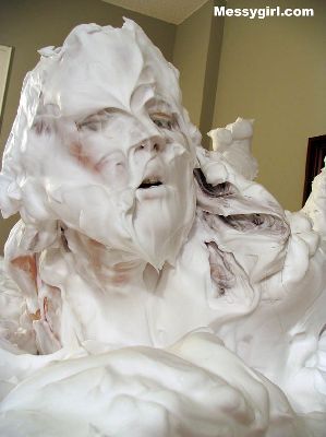 Linda dives face first into a bed of shaving cream. She rolls around until she is covered head to toe.