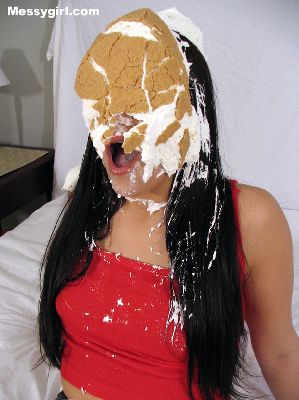 Busty and sexy Tribeca does her first every messy shoot. She didn't know what she was in for, but after the pies creamed her face she loved it!
