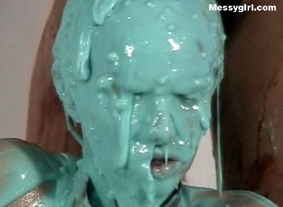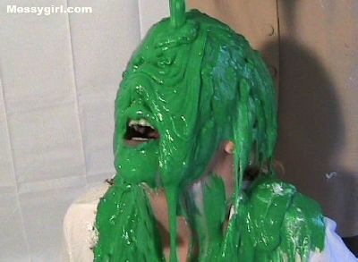 Mila is a very naughty Messygirl as she plays with 2 large dildos while she gets pied and slimed.