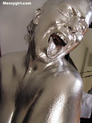 Busty Vicky covers herself head to toe in silver paint. She loves how it looks on her.