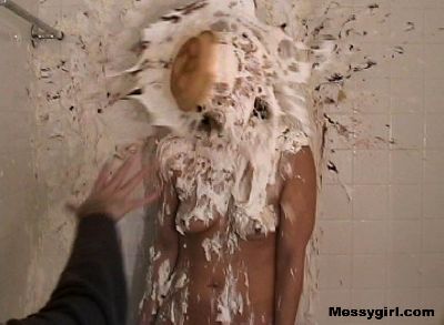 Tomiko's relaxing shower turns into a non stop pie attack. She ends up rubbing the pie slop all over herself.